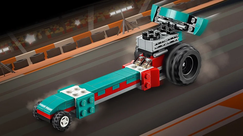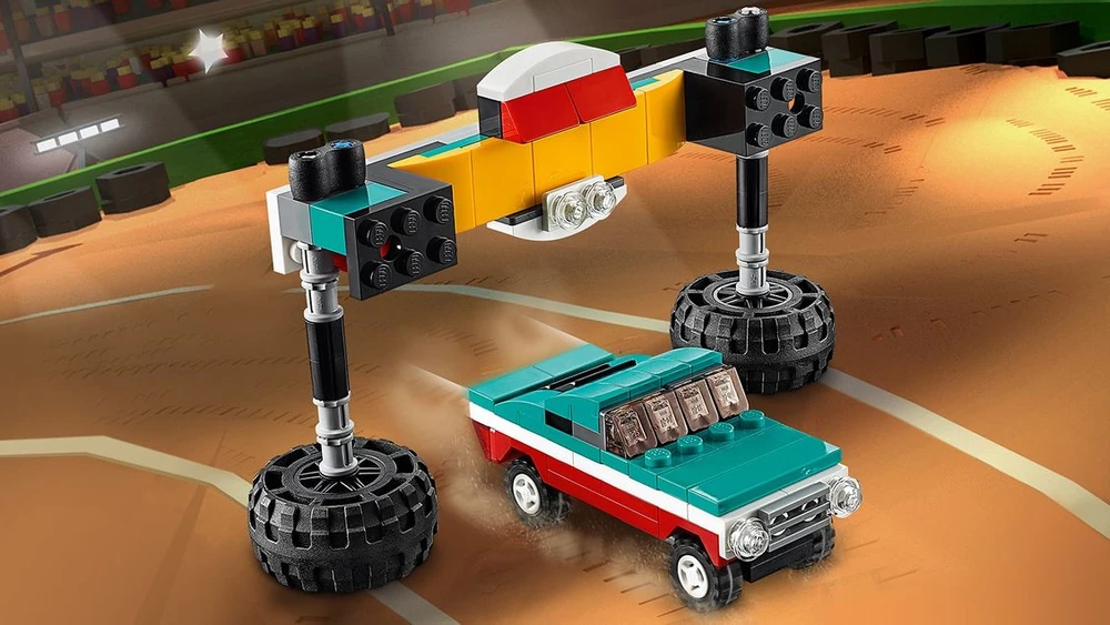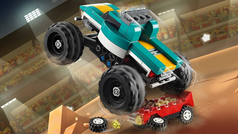 Maak je op om auto’s te verpletteren in deze monstertruck! Rijd een rondje om de werkende vering te testen, zet vervolgens de sloopwagen op zijn plaats en start de show! Na het uithalen van de coolste stunts kun je de monstertruck ombouwen tot een raceauto met finishlijn of verander je hem in een dragster en verbreek je het snelreidsrecord. Of laat je creativiteit de vrije loop en bouw iets nieuws. Kun jij deze krachtige 3-in-1 voertuigen de baas?
