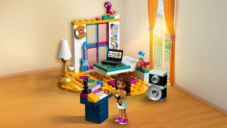 LEGO® Friends 41341 Andrea’s slaapkamer staat op een gele, hartvormige bouwplaat en is een perfecte weerspiegeling van Andrea’s voorliefde voor muziek en optredens. Het bed kan worden opgeklapt om een plek te creëren waar Andrea zich kan omkleden of samen met haar papegaai kan repeteren. Ze heeft ook een piano, een gitaar, een luidspreker, een lamp en een laptop om zelf nummers te schrijven. Inclusief een minipoppetje en een figuur van een papegaai.