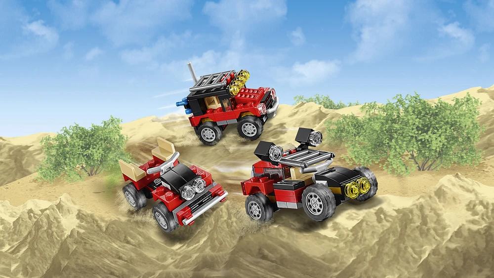 Scheur door zanderig of rotsachtig gebied met de Woestijnracers terreinwagen met cool rood-zwart-beige kleurenschema, gele waarschuwingslichten, bumperbeugel, veiligheidskooi en grote banden met diep profiel. Dit 3-in-1 LEGO® Creator model kan worden omgebouwd tot een 4×4 of een zandbuggy voor een driedubbele bouw- en speelervaring, of worden gecombineerd met andere mini-voertuigsets voor nog meer speelscenario’s.